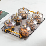 轻奢长方形托盘家用分格糖果盘放水杯塑料茶盘水果盘干果收纳盘 琥珀塑料6碟+盖+琥珀托盘