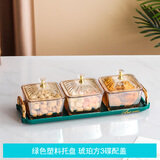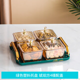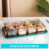 轻奢长方形托盘家用分格糖果盘放水杯塑料茶盘水果盘干果收纳盘 绿塑料托盘+琥珀玻璃方8碟配盖