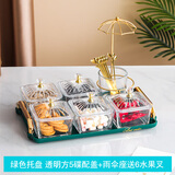 轻奢长方形托盘家用分格糖果盘放水杯塑料茶盘水果盘干果收纳盘 绿托盘+透明方5碟配盖+水果叉座