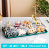 轻奢长方形托盘家用分格糖果盘放水杯塑料茶盘水果盘干果收纳盘 绿托盘+琥珀方7碟配盖+水果叉座
