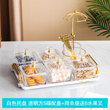 轻奢长方形托盘家用分格糖果盘放水杯塑料茶盘水果盘干果收纳盘 白托盘+透明方5碟配盖+水果叉座
